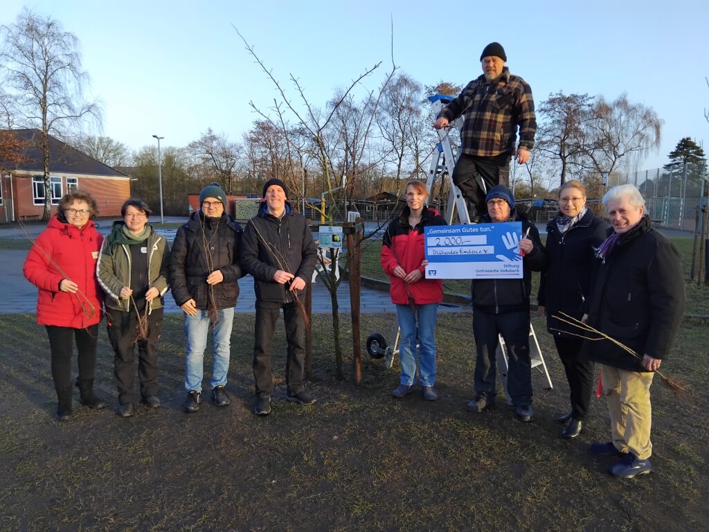 Im Rahmen eines Obstbaumschnitt- und Veredelungskurses durfte der Verein „Blühendes Emden e. V.“ besonderen Besuch begrüßen: Frau Wilken von der Stiftung Ostfriesische Volksbank überreichte einen Spendenscheck in Höhe von 2.000 Euro an den Verein.