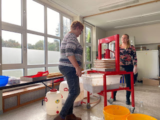 Bis abends wurden die guten Äpfel aussortiert, geschnitten und gepresst, um ca. 500 l köstlichen, frischen Saft zu erhalten.